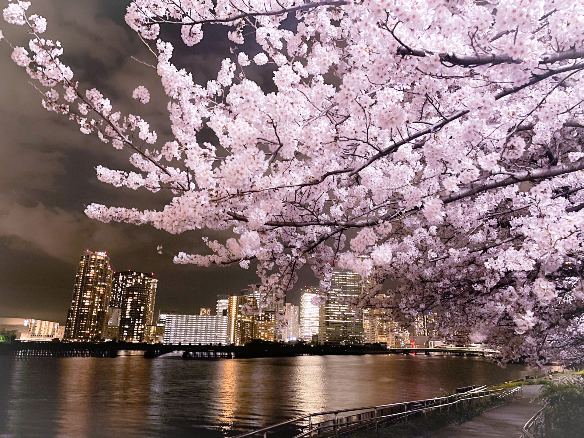隅田川沿いには、東京スカイツリーや東京タワーなどの高層ビル群が立ち並んでいます。夜になると、ライトアップされた桜と高層ビル群のコラボレーションを楽しむことができます。